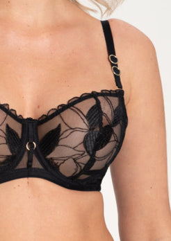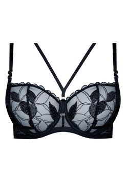 Die Konstruktion aus Tüll mit hoher Grammatur ist federleicht, bietet aber zuverlässigen Halt. Besonders praktisch: ein abnehmbarer, regulierbarer Straps verleiht Ihrem Look zusätzliche Styling-Optionen. Nicht abnehmbare, verstellbare Träger mit goldenen Schieberringen garantieren perfekten Sitz und Komfort, während eine handgefertigte Kokarde in der Mitte feminine Akzente setzt.