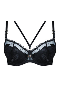 Die Cups sind innen mit weichem Baumwollschaum ausgekleidet und sorgen für angenehmen Tragekomfort sowie natürliche Kontur. Edle polnische Stickerei in zeitlosem Schwarz verleiht dem BH luxuriösen Charme, während der Tüll mit hoher Grammatur leicht bleibt und gleichzeitig stabilen Halt bietet. Ein abnehmbarer, regulierbarer Straps setzt sinnliche Akzente und erhöht die Styling-Flexibilität.