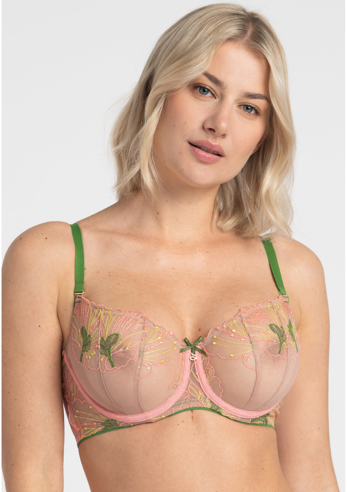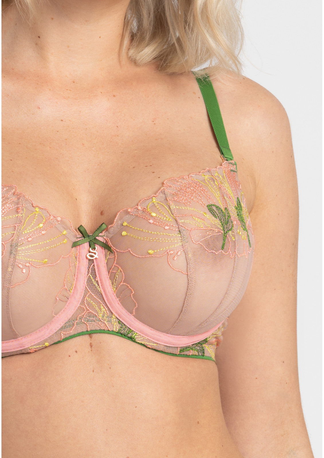 Gefertigt aus feiner polnischer Stickerei und Tüll hoher Grammatur, erzeugt der BH einen dezenten Tattoo-Effekt auf der Haut und bietet zugleich stabile Unterstützung. Abnehmbare, verstellbare Träger sorgen für individuelle Passform; der hochwertige Materialmix garantiert Tragekomfort den ganzen Tag. Feine Details wie die handgefertigte Kokarde und goldene Beschläge runden das Design ab.