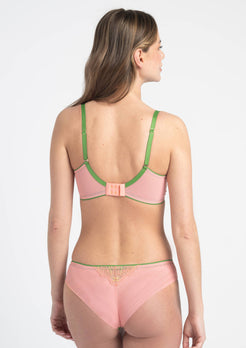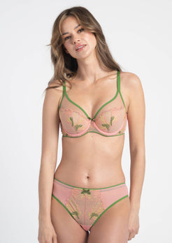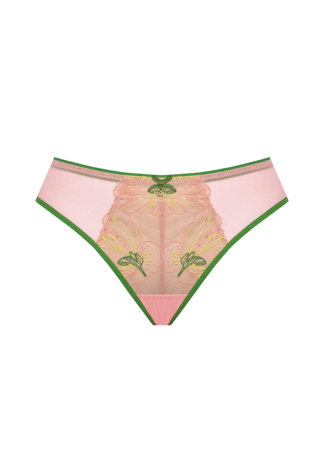 Gefertigt aus feiner polnischer Stickerei im Hibiskus-Motiv, verleiht die M300 jedem Outfit eine elegante, sommerliche Note — perfekt unter engen Looks oder als bewusstes Style-Element. Das Schrittfutter aus 100 % Baumwolle garantiert Atmungsaktivität und Hautfreundlichkeit, während der Tüll mit recycelten Fasern Leichtigkeit mit nachhaltigem Anspruch verbindet. Dezente Details wie die handgefertigte Schleife und goldene Akzente runden das Design ab.