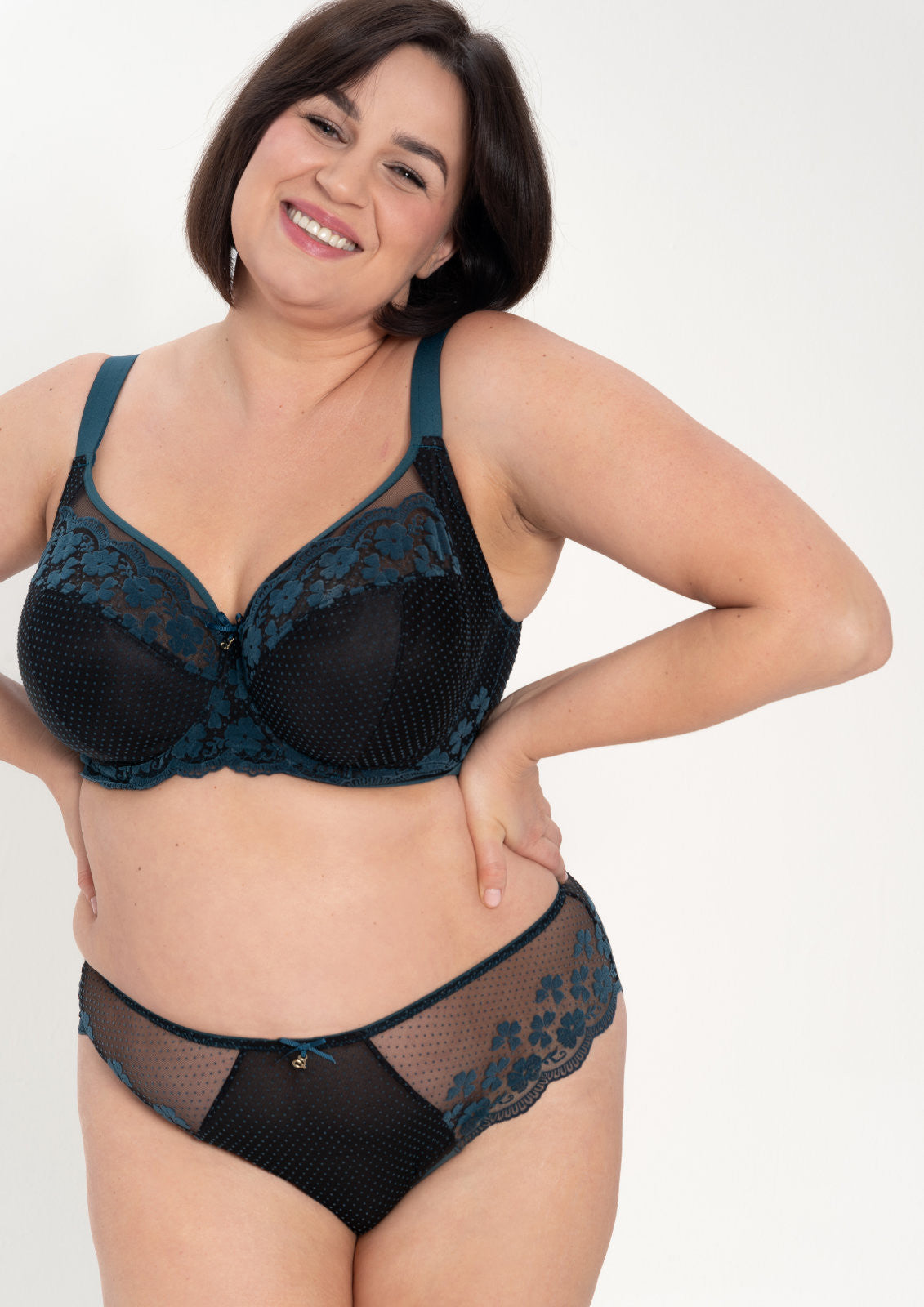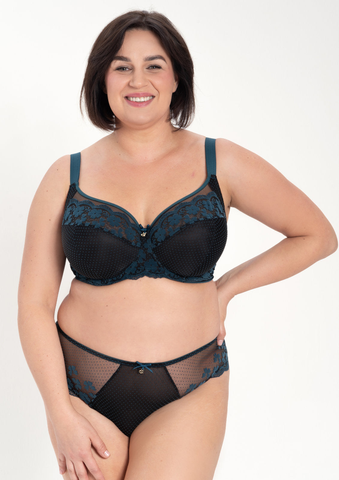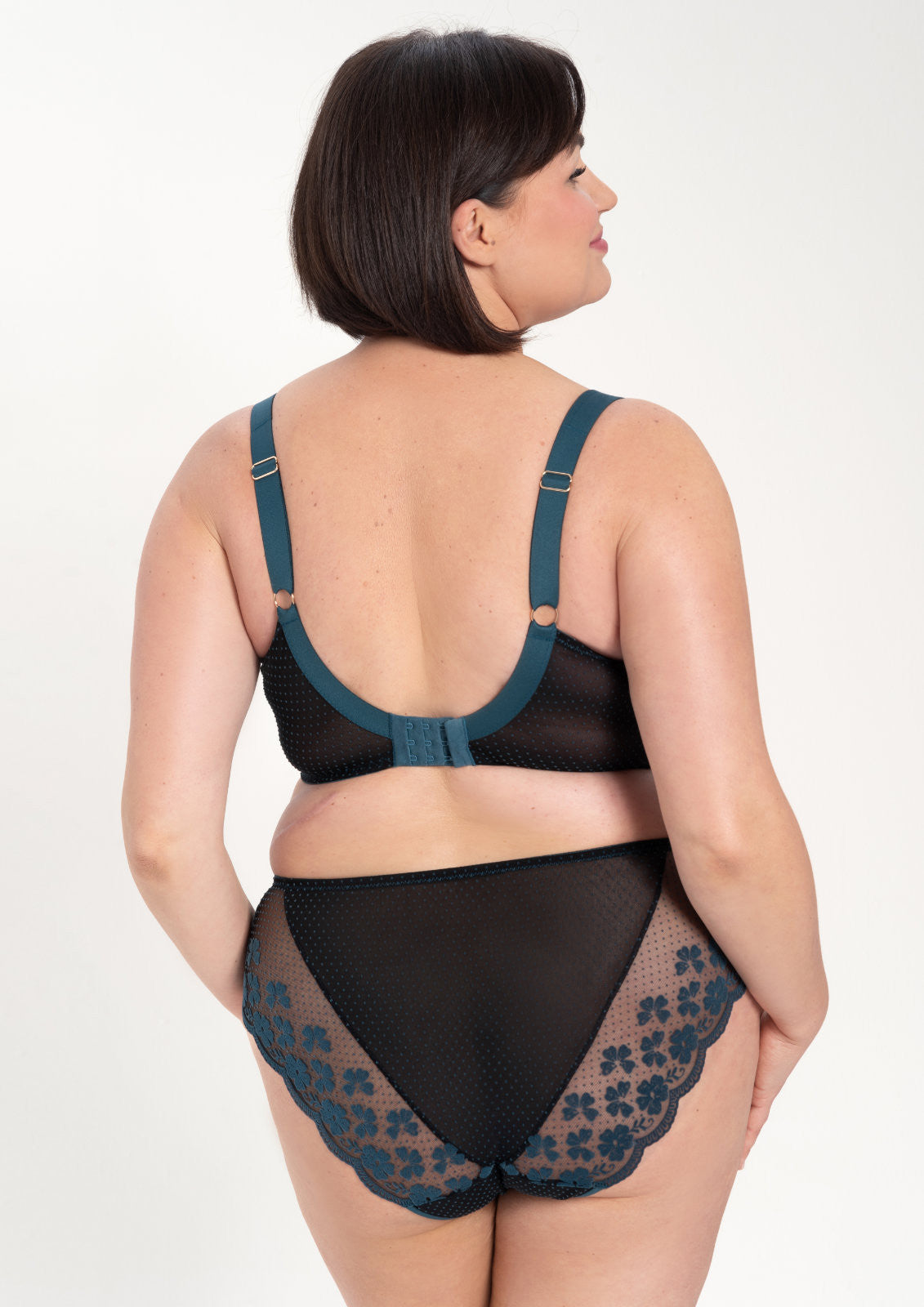 Der breite Seitenbund mit dreireihigem Hakenverschluss (3x3) sorgt für sicheren, individuell einstellbaren Sitz, während breite Träger mit weicher Schaumstoffpolsterung die Schultern entlasten und den ganzen Tag Komfort bieten. Der Untercup aus stabiler Strickware modelliert die Form, der hochwertige Tüll mit hoher Grammatur ist leicht und gewährleistet zuverlässigen Halt.