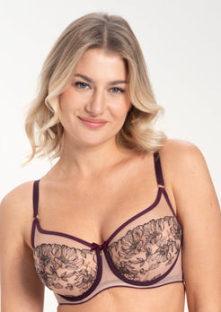 Die intensive Aubergine-Farbe der Silvia-Linie verleiht Energie und Selbstbewusstsein; glänzende Soft-Lurex-Fäden setzen edle Akzente, ohne die Haut zu reizen. Der sinnliche Tattoo-Effekt der Stickerei wirkt auf der Haut wie ein filigranes Accessoire, während der Tüll mit hoher Grammatur leichte Stabilität bietet. Dezente Flok-Punkte runden das Design stilvoll ab.